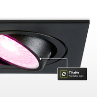 This square, smart recessed downlight features 16.5 million colors and is fully tiltable. This allows you to use the recessed downlights to create the most beautiful lighting accents. You can control the recessed downlights via your smartphone, voice or light switch. To control the recessed downlights by voice, simply pair it with your favorite smart assistant, for example: Google Home, Amazon Alexa or Siri. The smart recessed downlight consumes 5.5 watts, producing 400lumen of light.