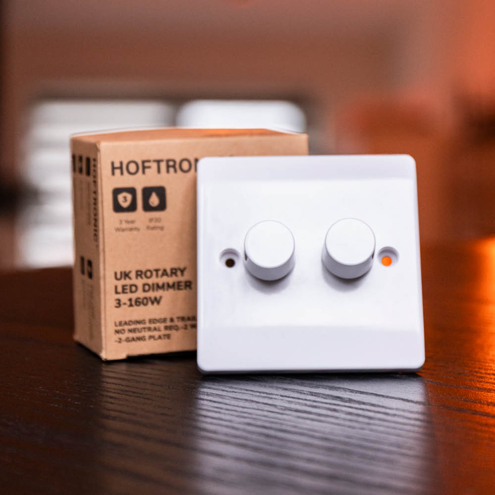 Avec ce variateur LED au format standard britannique, vous contrôlez votre éclairage de manière fluide, silencieuse et économe en énergie. Le variateur est livré en kit complet, avec une plaque « 2-gang » et un bouton rotatif, conforme aux dimensions d’encastrement courantes au Royaume-Uni. Il s’intègre donc parfaitement dans les boîtes murales britanniques existantes et convient aussi bien aux rénovations qu’aux nouvelles installations ou au remplacement d’anciens variateurs.