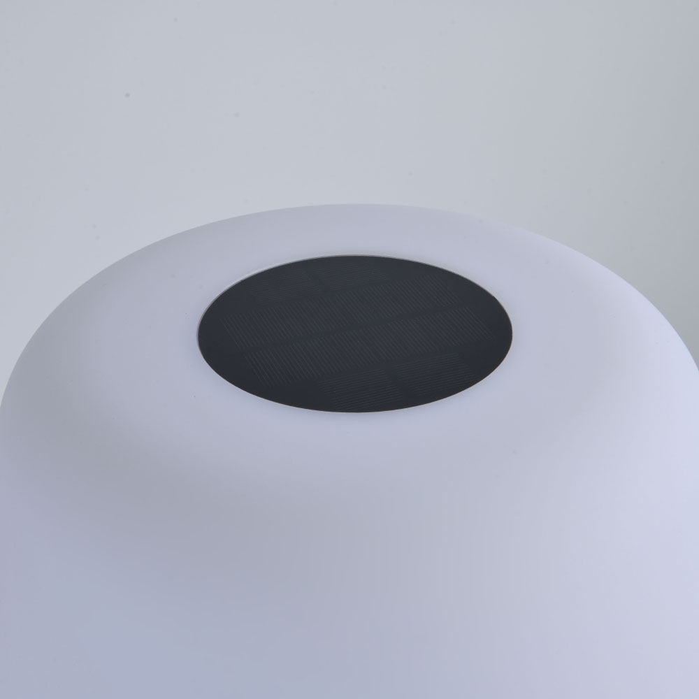 De lamp staat op een ronde metalen voet van ijzer, die zorgt voor stabiliteit en stevigheid en de lamp geschikt maakt voor buitengebruik, ook wanneer er wat wind staat. De voet is afneembaar, wat het verplaatsen en opbergen vergemakkelijkt. Het armatuur zelf is gemaakt van PE-kunststof, een materiaal dat goed tegen allerlei weersinvloeden kan en het licht mooi egaal verspreidt.