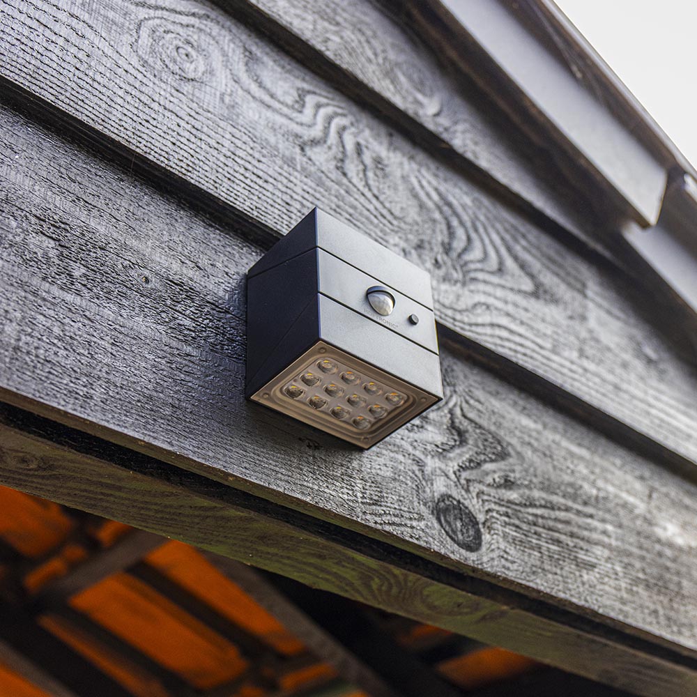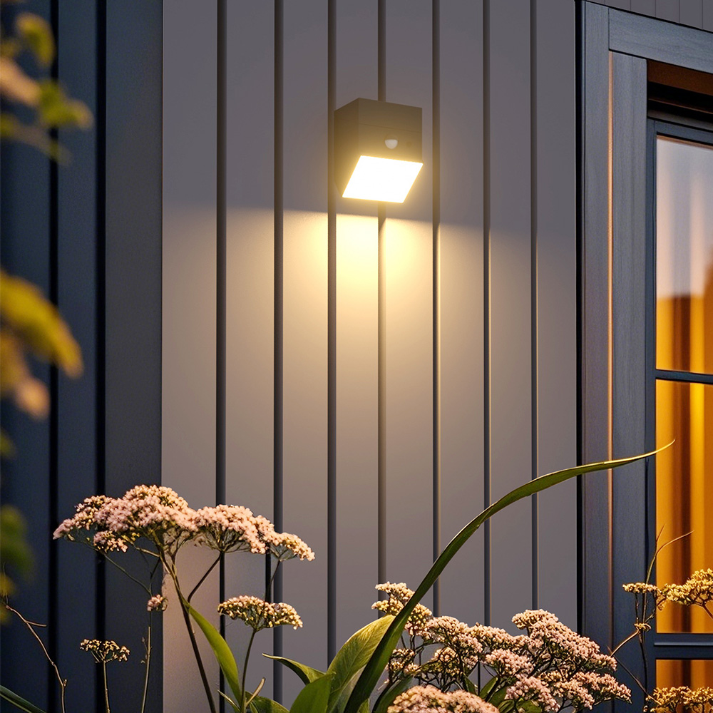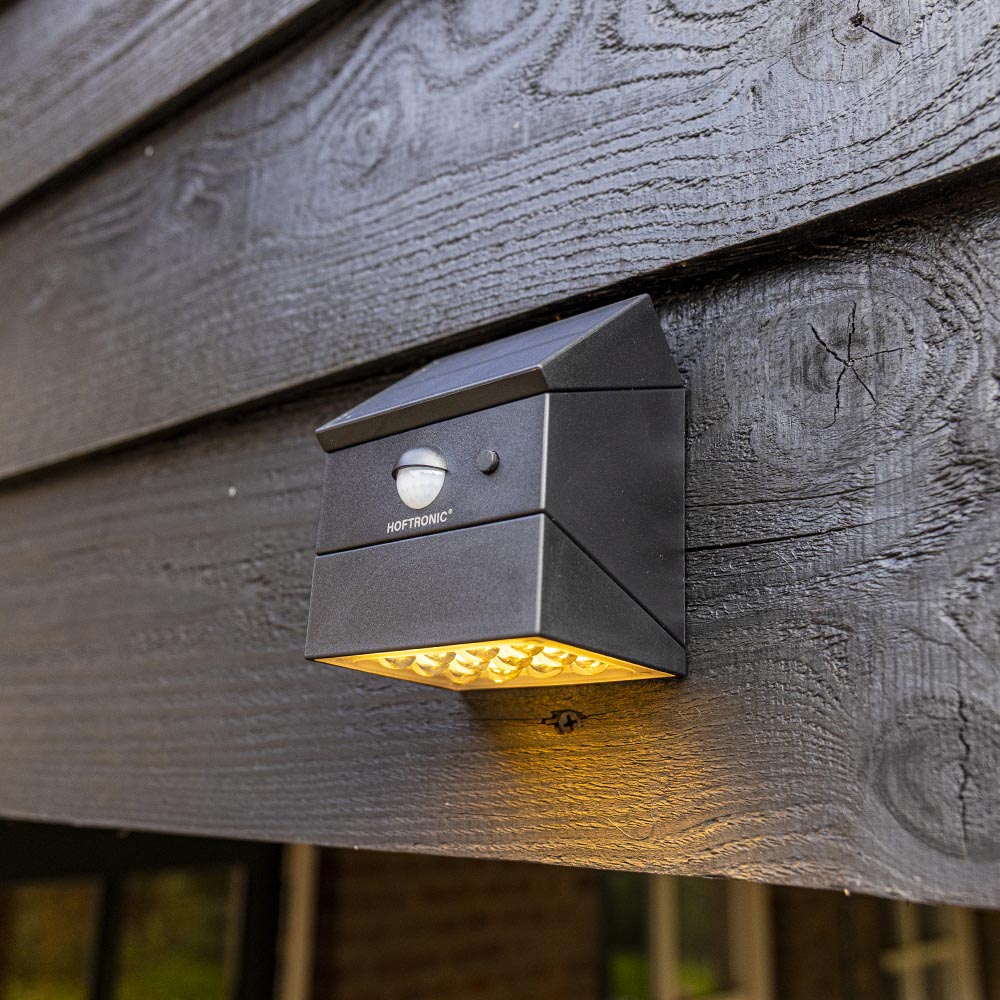 Die solarbetriebene Wandleuchte reagiert auf Bewegung. Je nach eingestelltem Lichtmodus wird die Lampe heller oder leuchtet, wenn sie eine Bewegung erkennt.