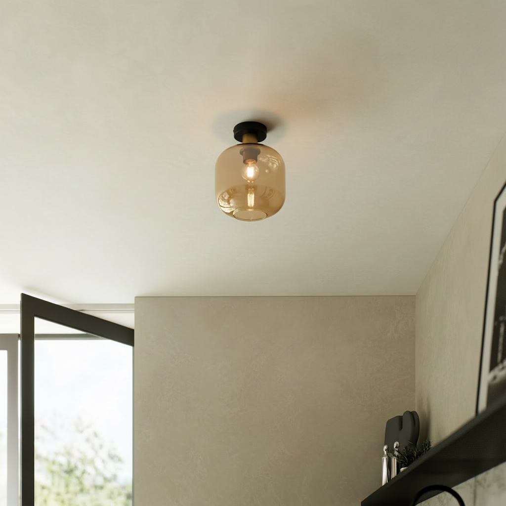 Eine einzelne Kugel aus bernsteinfarbenem Glas hängt ruhig an einer runden schwarzen Halterung herunter. Diese runde Deckenplatte ist kleiner als die Kugel selbst, wodurch die Lampe fast schwerelos zu schweben scheint. Dieses minimalistische Design verleiht jedem Raum eine ruhige, zeitlose Eleganz.