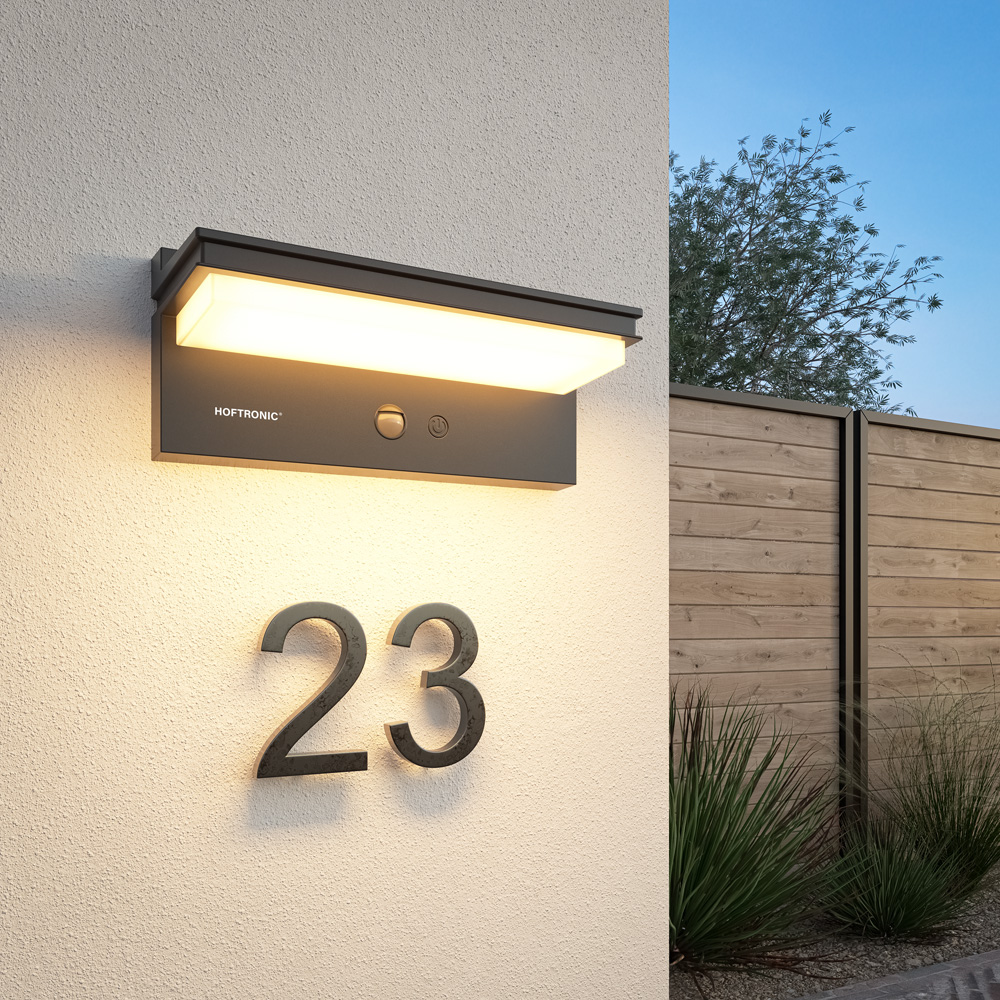 Die solarbetriebene Wandleuchte reagiert auf Bewegung. Je nach eingestelltem Lichtmodus wird die Lampe heller oder leuchtet, wenn sie eine Bewegung erkennt.