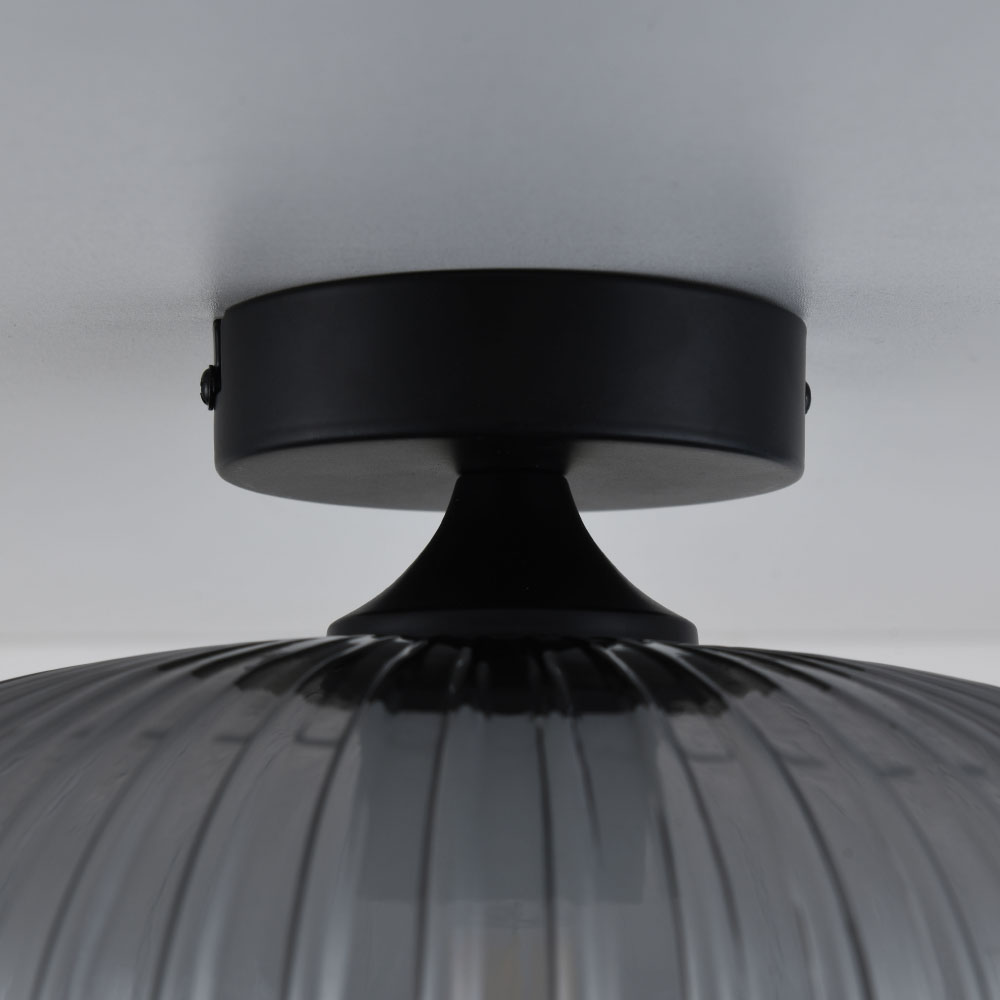Plafonnier Ovale vetro fumé - Douille E27 - Sphère en verre fumé strié - Support noir en forme de volcan - IP20 pour utilisation à l'intérieur