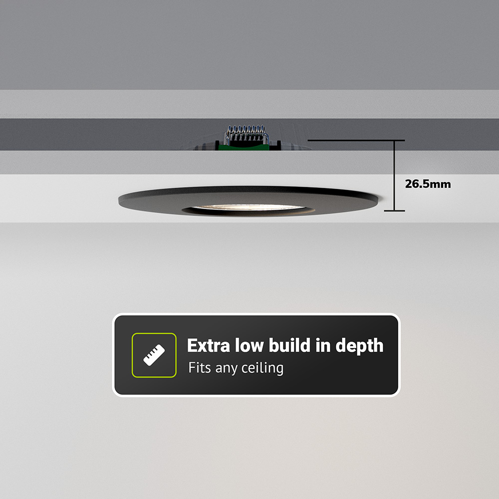 Trotz seines geringen Verbrauchs von nur 6 Watt liefert der Einbaustrahler 570 Lumen bei 4000K und ersetzt damit eine herkömmliche 50-Watt-Halogenlampe. Mit einem Durchmesser von 83 mm und einem Lochmaß von 68-75 mm ist er vielseitig einsetzbar. Die besonders geringe Einbautiefe von nur 25 mm macht diesen flachen Einbaustrahler LED ideal für Decken mit wenig Platz. Der Abstrahlwinkel von 38° sorgt für eine angenehme und gleichmäßige Lichtverteilung.