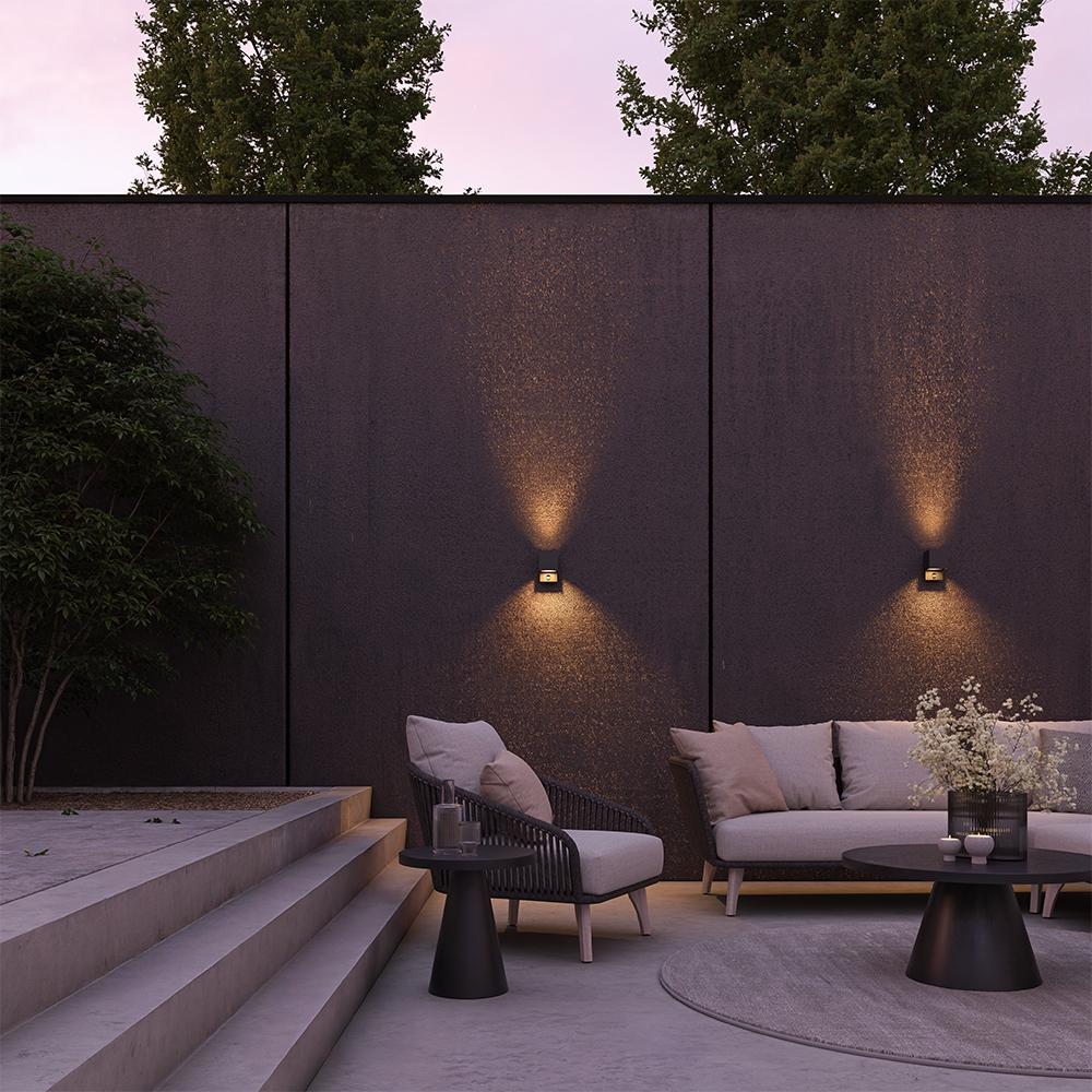 Die kubische Wandleuchte strahlt ein stimmungsvolles warmweißes Licht von 3000 K Kelvin aus. Dank der hohen Wasser- und Staubdichtigkeit der Leuchte mit Schutzart IP65 kann sie sowohl im Innen- als auch im Außenbereich überall aufgehängt werden. Mit einer extra dicken, feuchtigkeitsbeständigen und UV-beständigen AKZO-Nobel-Pulverbeschichtung bleibt auch das Äußere der Lampe schön und rostfrei für einen langjährigen Einsatz.