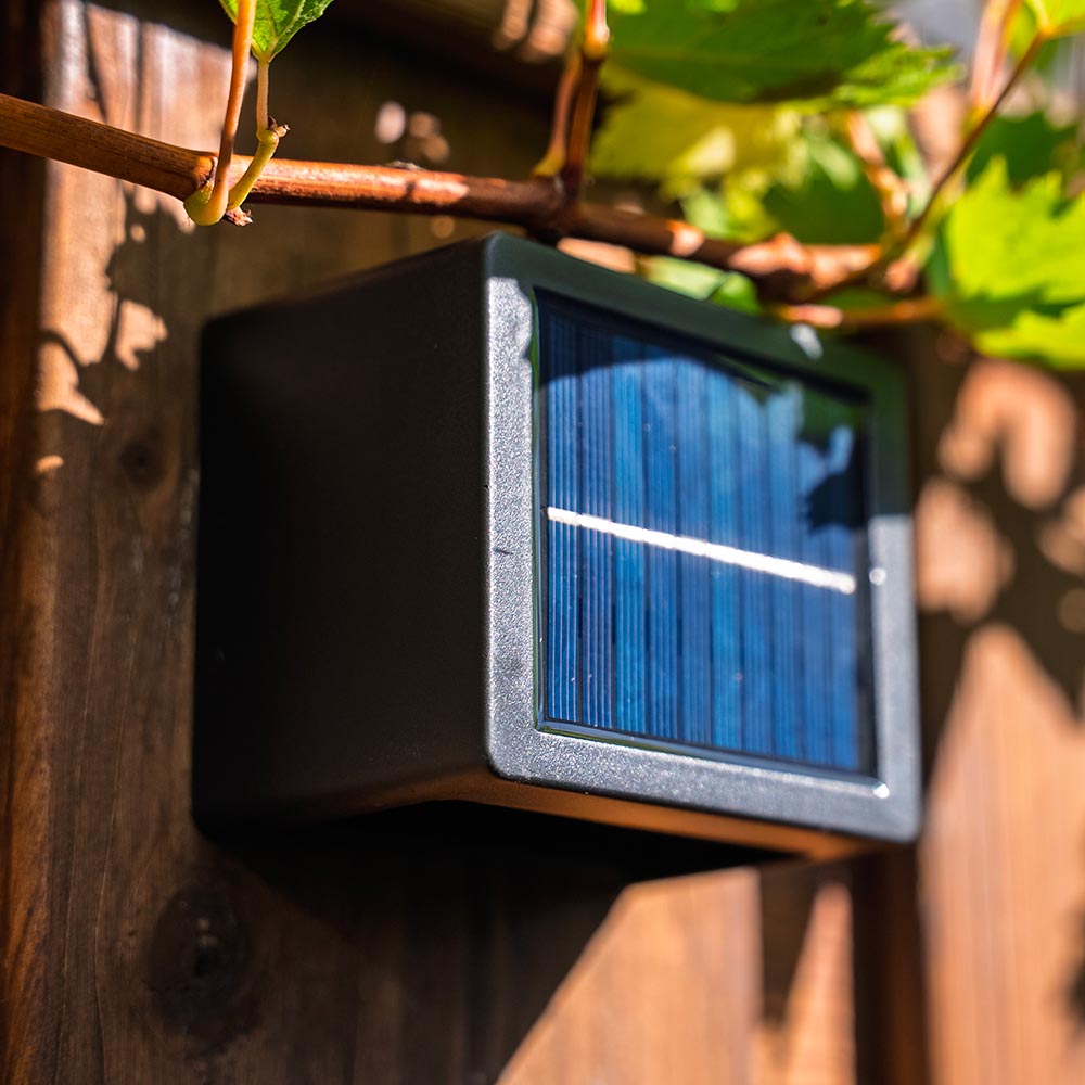 Diese Solar-Wandleuchte leuchtet nach oben und unten. So entstehen zwei schöne Lichtkegel an Ihrer Fassade, Ihrem Zaun oder Ihrem Schuppen. Stilvoll und modern.