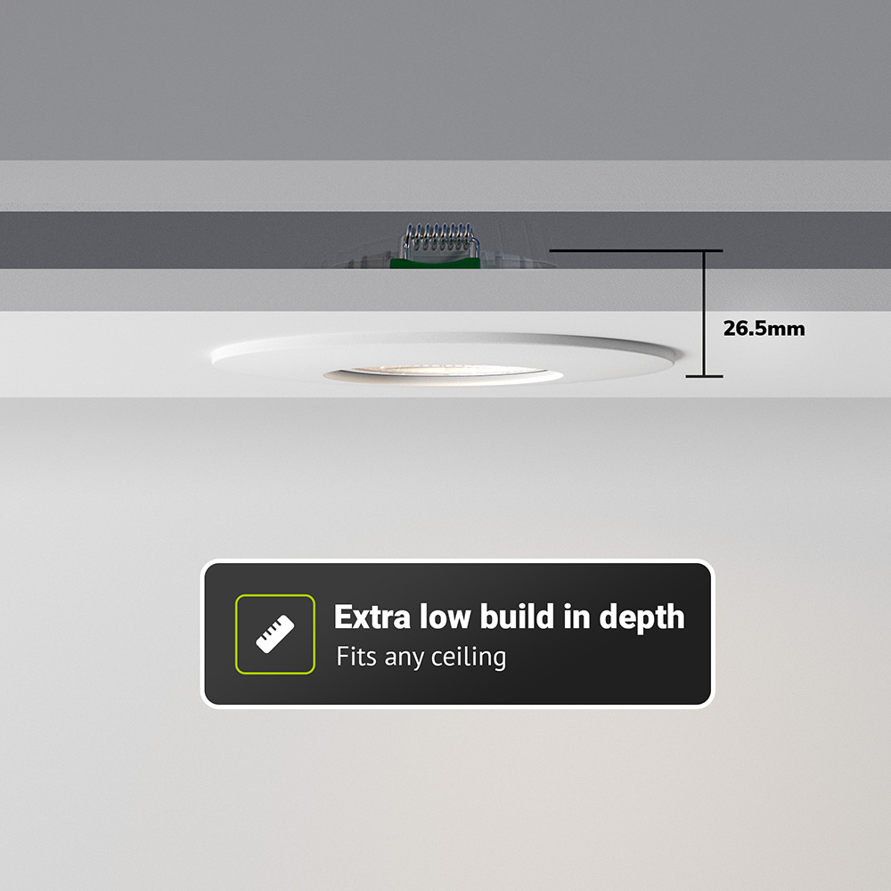Trotz seines geringen Verbrauchs von nur 6 Watt liefert der Einbaustrahler 570 Lumen bei 4000K und ersetzt damit eine herkömmliche 50-Watt-Halogenlampe. Mit einem Durchmesser von 83 mm und einem Lochmaß von 68-75 mm ist er vielseitig einsetzbar. Die besonders geringe Einbautiefe von nur 25 mm macht diesen flachen Einbaustrahler LED ideal für Decken mit wenig Platz. Der Abstrahlwinkel von 38° sorgt für eine angenehme und gleichmäßige Lichtverteilung.
