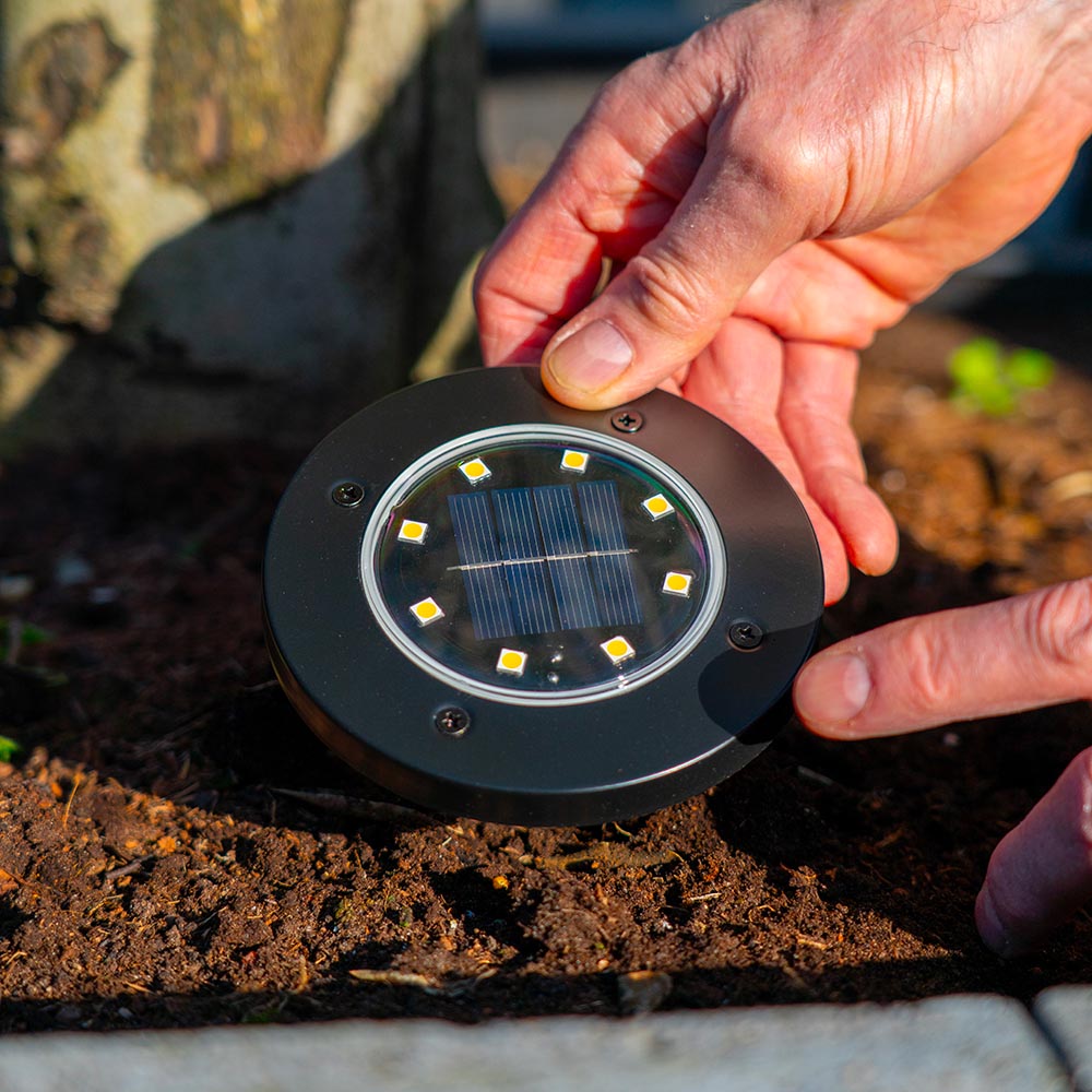 Diese Solar-Bodeneinbaustrahler verfügen über 8 LEDs. Das sorgt dafür, dass sie den Garten vollständig und gut ausleuchten können. Die Solar-Bodeneinbaustrahler sind nach IP65 wasserdicht und damit resistent gegen Regen, Schnee, Graupel und Staub. Die Bodeneinbaustrahler sind mit einem Dämmerungsschalter ausgestattet. Das heißt, die Strahler schalten sich automatisch ein, wenn die Dämmerung einsetzt. Dank des Solarpanels laden sich die Strahler tagsüber automatisch auf.