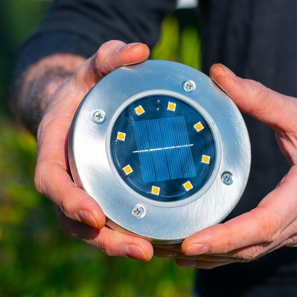 Diese Solar-Bodeneinbaustrahler verfügen über 8 LEDs. Das sorgt dafür, dass sie den Garten vollständig und gut ausleuchten können. Die Solar-Bodeneinbaustrahler sind nach IP65 wasserdicht und damit resistent gegen Regen, Schnee, Graupel und Staub. Die Bodeneinbaustrahler sind mit einem Dämmerungsschalter ausgestattet. Das heißt, die Strahler schalten sich automatisch ein, wenn die Dämmerung einsetzt. Dank des Solarpanels laden sich die Strahler tagsüber automatisch auf.