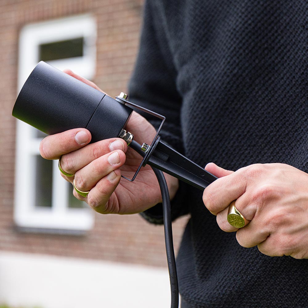 Der Scheinwerfer des Spikey kann um 360 Grad geschwenkt und gedreht werden. So kannst du sehr präzise die schönsten Lichtakzente setzen. Der Gartenstrahler hat eine GU10 Fassung. Damit kannst du die Lichtfarbe und den Abstrahlwinkel selbst bestimmen. Standardmäßig können die Gartenstrahler auf zwei Arten montiert werden. Mit dem Erdspieß kannst du den Gartenstrahler einfach in den Boden stecken oder mit Schrauben an der Wand befestigen.