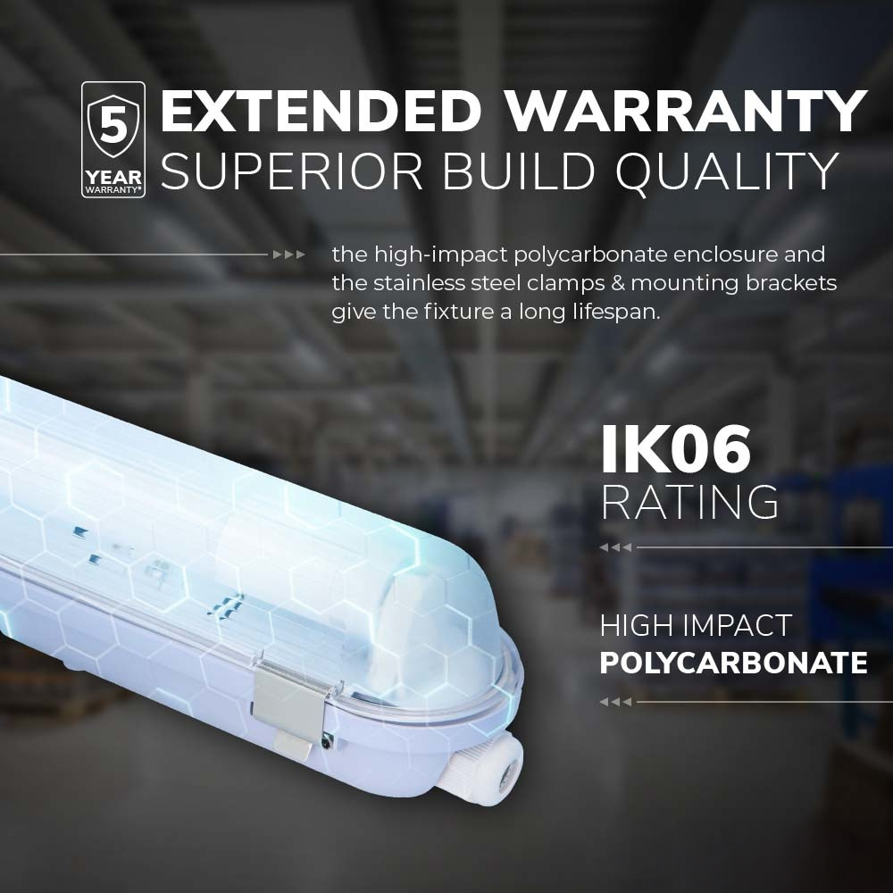 Diese IP-Klassifizierung macht diese LED-Leuchtstofflampe für alle nassen und trockenen Bereiche geeignet. Denk an Kühlräume, Werkstätten, Lagerhäuser, Fabrikhallen und Lagerbereiche im Außenbereich.