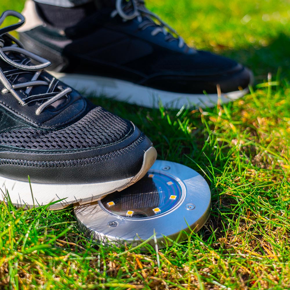 An der Spitze des Bodeneinbaustrahlers befindet sich ein Solarpanel. Dieses sorgt dafür, dass die Batterie des Bodeneinbaustrahlers tagsüber voll aufgeladen ist.