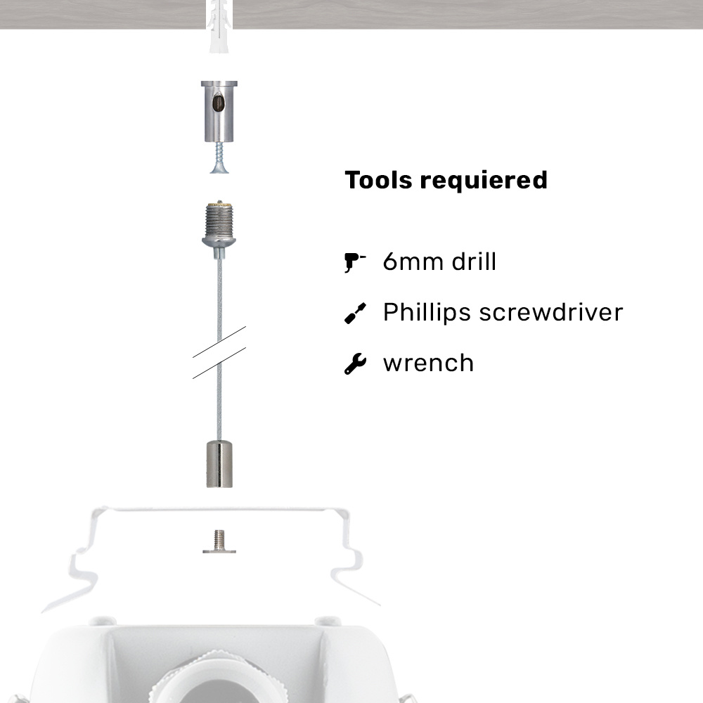 Der Bausatz wird komplett montiert geliefert. In der Verpackung sind 4 Kabel und das gesamte Montagematerial enthalten. Sie können also sofort mit der Aufhängung Ihrer LED-Paneele beginnen.