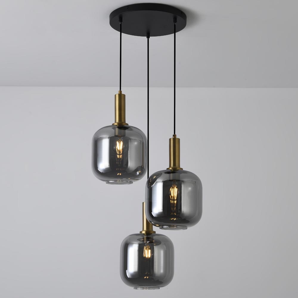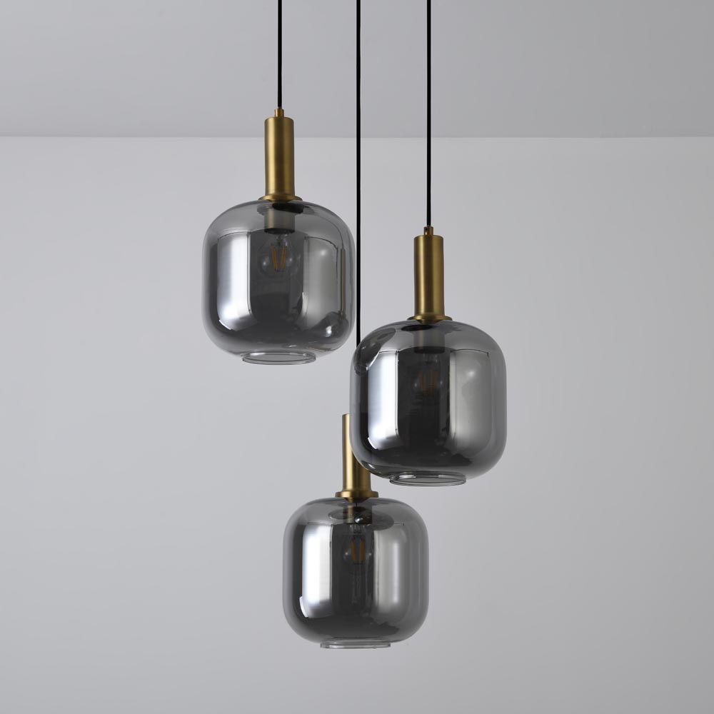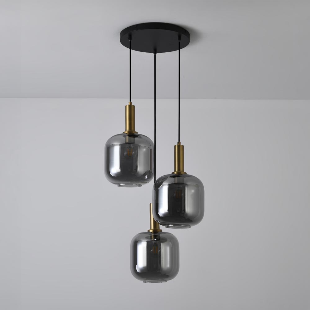 Drei raffiniert geformte Glaskugeln, subtil länglich und aus wunderschönem Rauchglas gefertigt, hängen in unterschiedlichen Höhen und an verschiedenen Seiten. Jede Kugel wird von einem minimalistischen schwarzen Kabel und einem zylinderförmigen goldenen Fuß getragen, der elegant an das Glas anschließt, wodurch eine raffinierte Mischung aus rohen und luxuriösen Akzenten entsteht, während die runde schwarze Deckenplatte dem Ganzen eine zeitgemäße und schlichte Grundlage bietet.