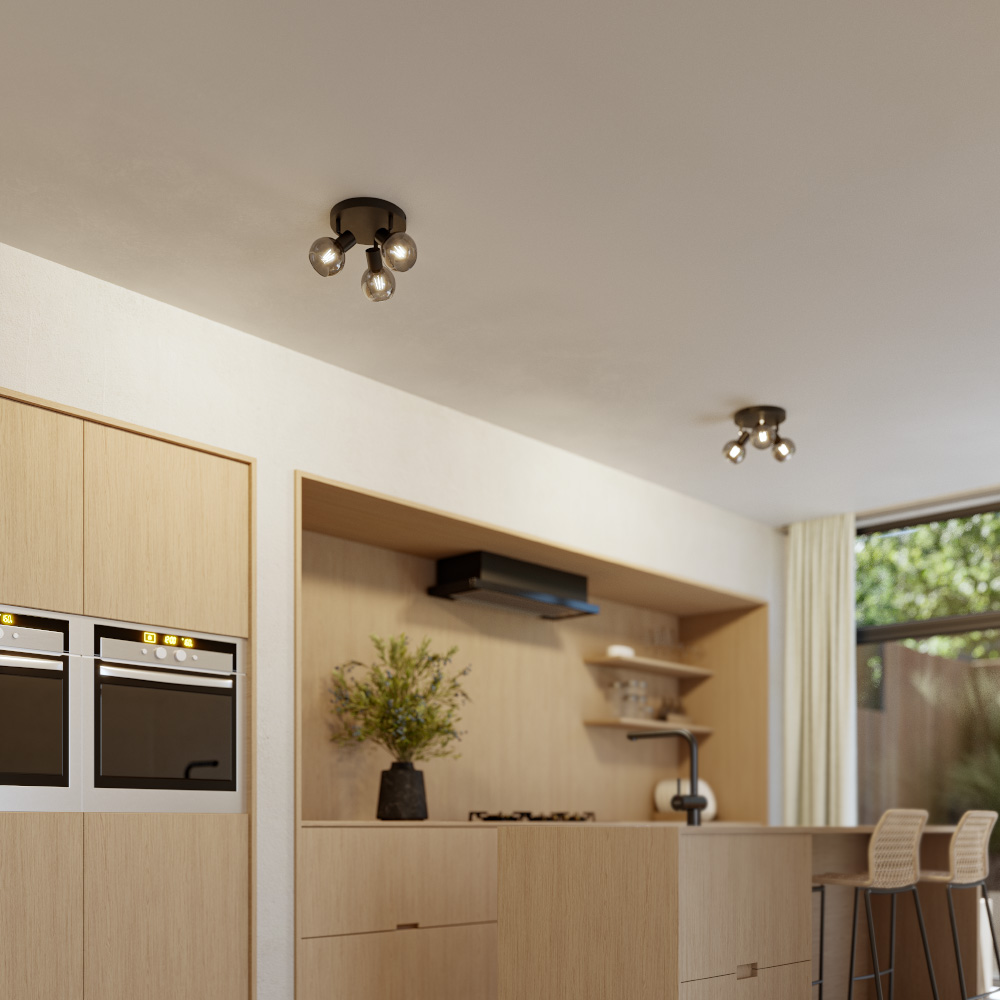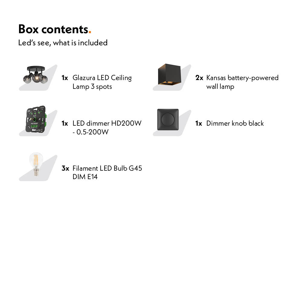Verleihe deinem Schlafzimmer mit nur einem Paket einen luxuriösen und stimmungsvollen neuen Look. Unser Komplettset „Kansas Glazura” kombiniert modernes Design, intelligente Funktionen und warme Beleuchtung, sodass dein Schlafzimmer sofort zu einer Oase des Komforts und Stils wird. Das Set besteht aus 2 batteriebetriebenen Kansas-Wandleuchten, 1 Glazura Smokey-Deckenleuchte mit 3 Spots, 3 dimmbaren E14-Glühbirnen, einem Dimmer und einem mattschwarzen Dimmerknopf. Alles, was du für eine komplette Neugestaltung deines Schlafzimmers benötigst.