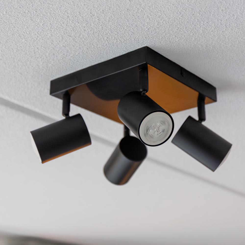 Die Deckenleuchte Lark ist ein echter Hingucker. Diese moderne Lampe hat 4 Spots, die sowohl schwenkbar als auch drehbar sind. Die Lark hat GU10-Fassungen und wird ohne Leuchtmittel geliefert. So kannst du deine Glühbirnen selbst aussuchen und sie ganz einfach austauschen, wenn sie mal nicht mehr so hell leuchten. Die Deckenleuchte ist aus Metall und hat eine mattschwarze Oberfläche.