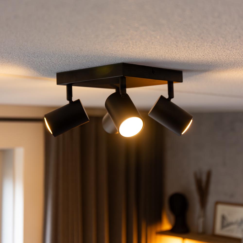 Diese Deckenleuchte hat eine GU10 Fassung und ist für alle GU10 Leuchtmittel geeignet. So können Sie jederzeit den Abstrahlwinkel, die Lichtfarbe und die Lichtleistung wählen.