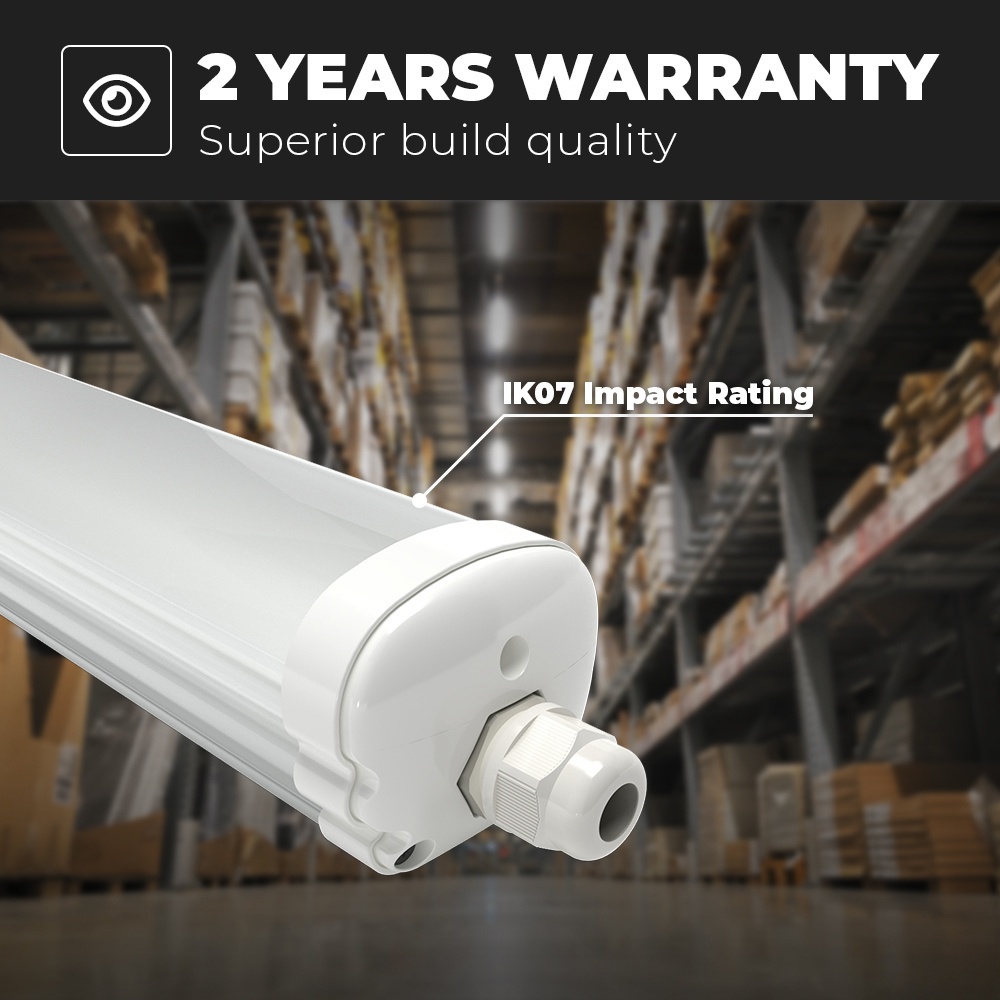 Diese tri-proof Lampen sind ideal für die Beleuchtung von feuchten und trockenen Räumen. Die LED-Leuchtstofflampen sind leicht verknüpfbar, so dass du schnell mehrere Lampen mit einem Schalter bedienen kannst. Diese Kopplung wird durch die eingebauten Anschlussverschraubungen besonders leicht gemacht. Diese sparsame LED-Leuchtstofflampe verbraucht nur 36 W und erzeugt eine Lichtleistung von 4320 Lumen. Eine Effizienz von 120 lm/W.