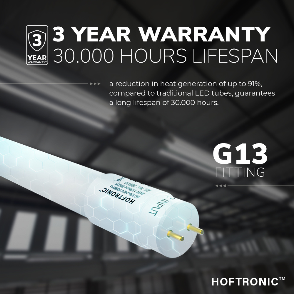 Mit einer Lebensdauer von 30.000 Stunden hält diese LED-Leuchtstofflampe mindestens 12 Jahre (250 Tage pro Jahr, 10 Stunden pro Tag). 12 Jahre sorgenfreies Licht.