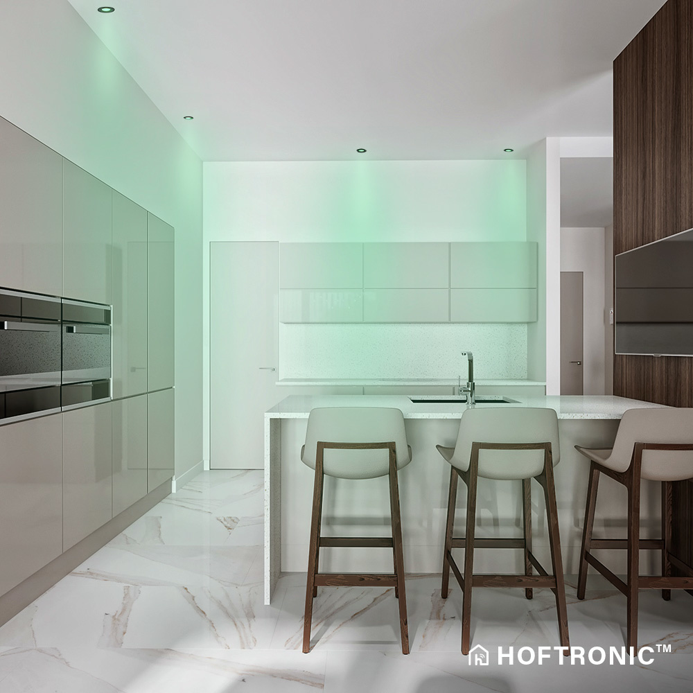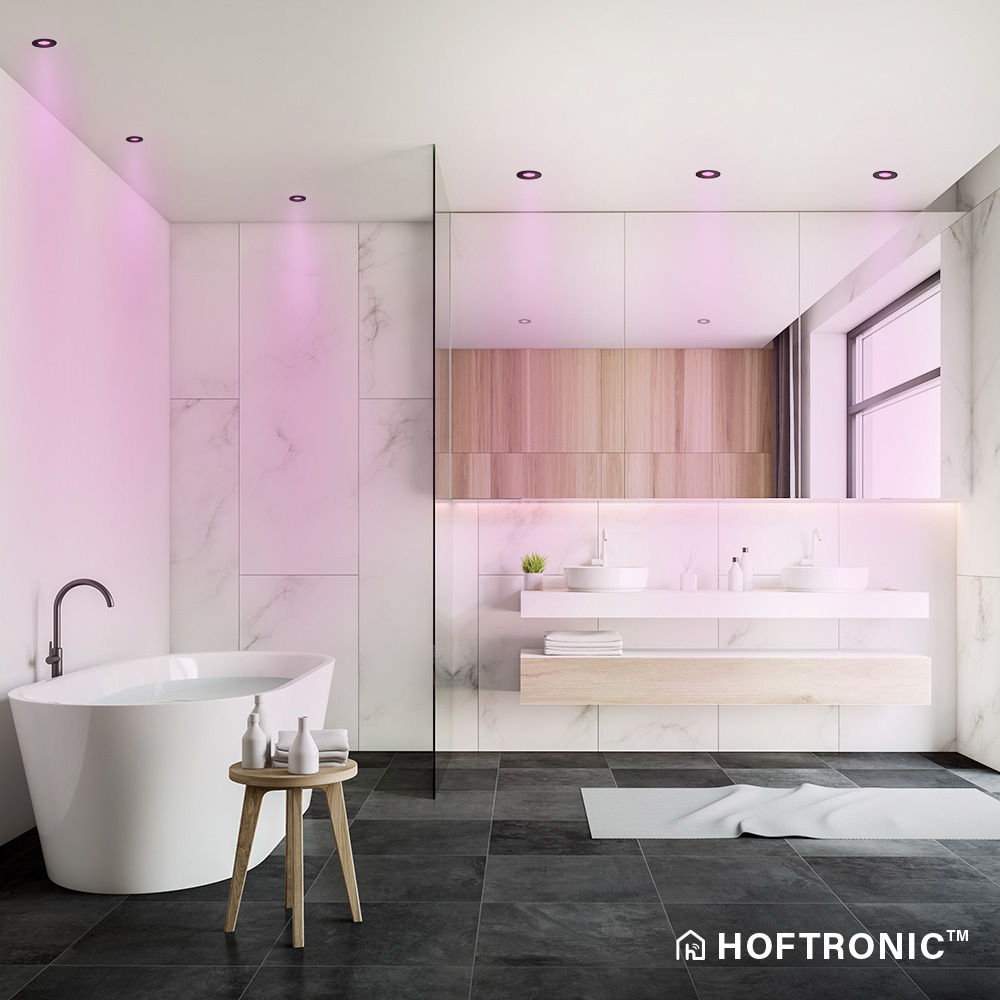 Verbinden Sie den Einbaustrahler mit der HOFTRONIC-App für Geofencing, Sprachsteuerung, Gruppierung, Wettersteuerung, 16,5M Farben, Biorhythmus und Dimmen.