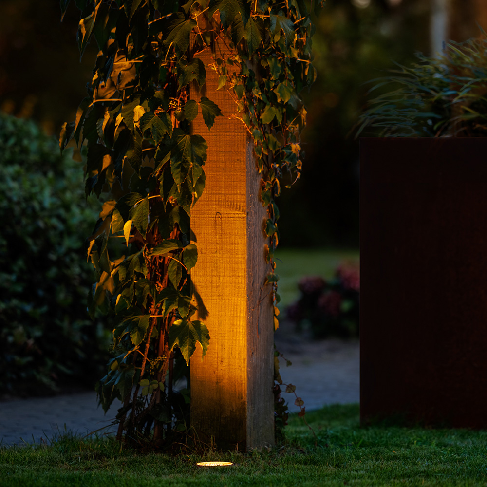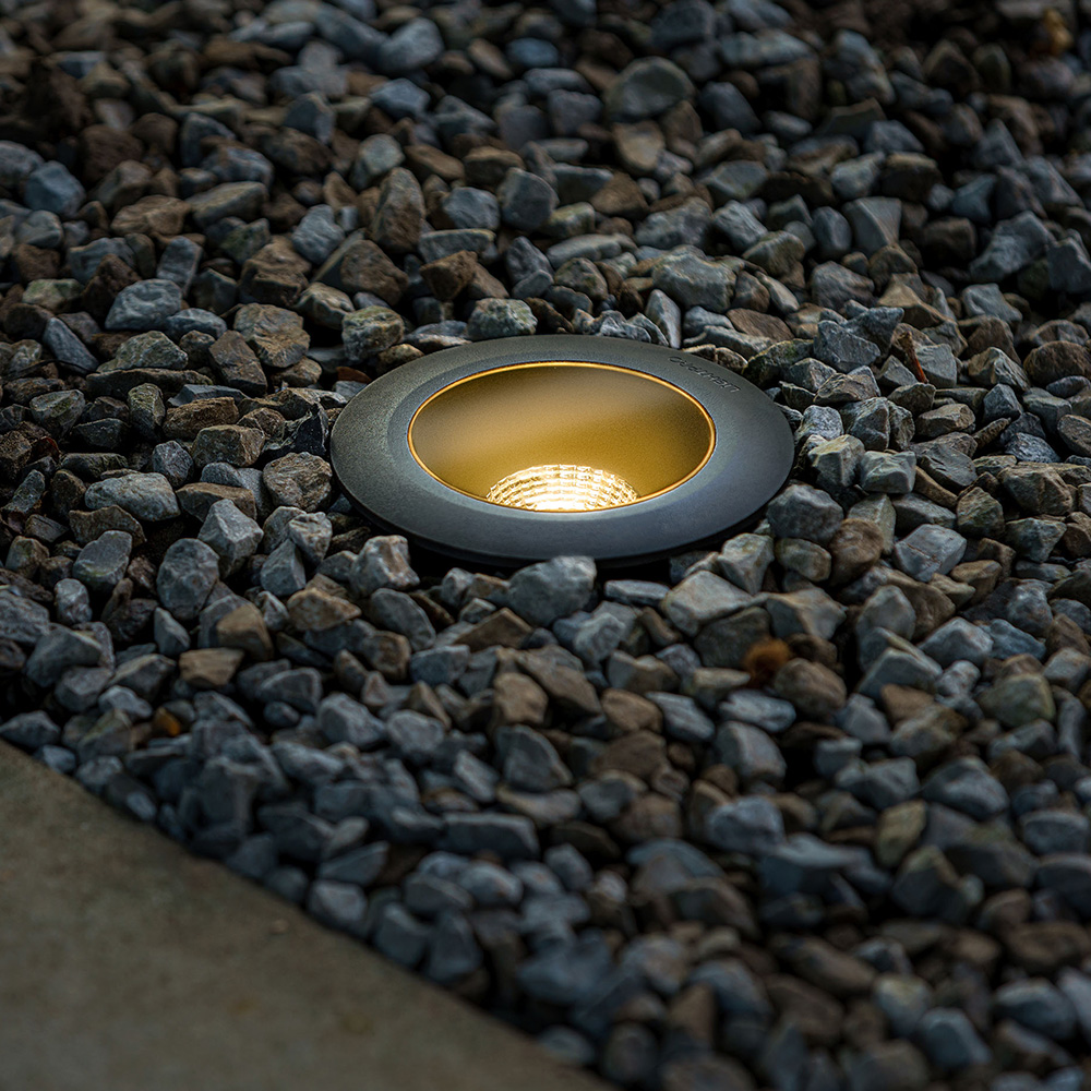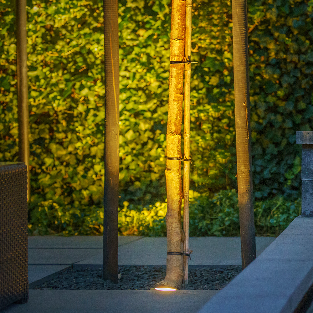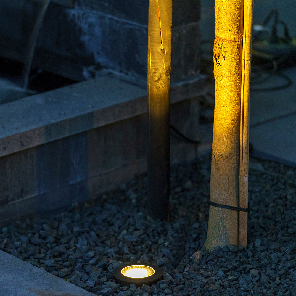 Lightpro Atik R1 jordspot – 12V LED er det ideelle valg til kraftfuldt at oplyse træer, beplantning eller en statue nedefra. Takket være den sorte ring og det antracitfarvede armatur falder spotten diskret ind i omgivelserne. Om dagen er den næsten usynlig i grus eller belægning, men om aftenen skaber den en imponerende lyseffekt. Atik R1 er dæmpbar, så du selv kan bestemme lysbilledet. For en variant med rustfri stålringsring vælg Lightpro Atik R2.
