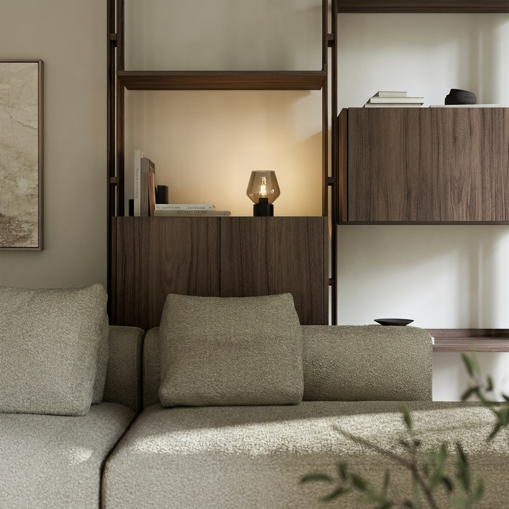 Aureta nero bordlampen falder straks i øjnene med sin særlige silhuet. Den røgfarvede glaskappe har form som en let afskåret kegle: rund i bunden, raffineret mod toppen og let tilspidset på begge sider. Denne flydende overgang skaber et elegant linjespil, der udstråler ro, mens det synlige lys inde i kappen spreder en varm glød.