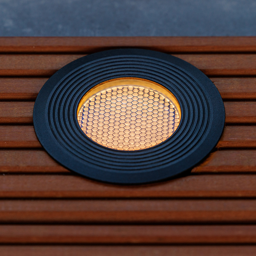 Lightpro Onyx 90 RA – 12V LED jordspot er en stor og stilfuld indbygningsspot, der er særdeles velegnet til orienterings- og stemningsbelysning. Den luksuriøse antracitfarvede ring giver spotten et moderne udseende, mens de medfølgende linser giver dig fuld frihed til at skabe det ønskede lyseffekt. Vælg mellem klart lys, diffust lys med matteret glas-linsen eller en anti-blændende effekt med honningkage-linsen. Så kan du tilpasse belysningen perfekt til din have.
