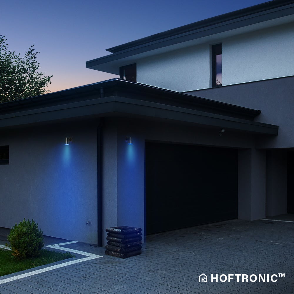 Because this smart wall light shines its light downward, it is great for placement above the garage door, high up on the facade or, of course, on the fence.