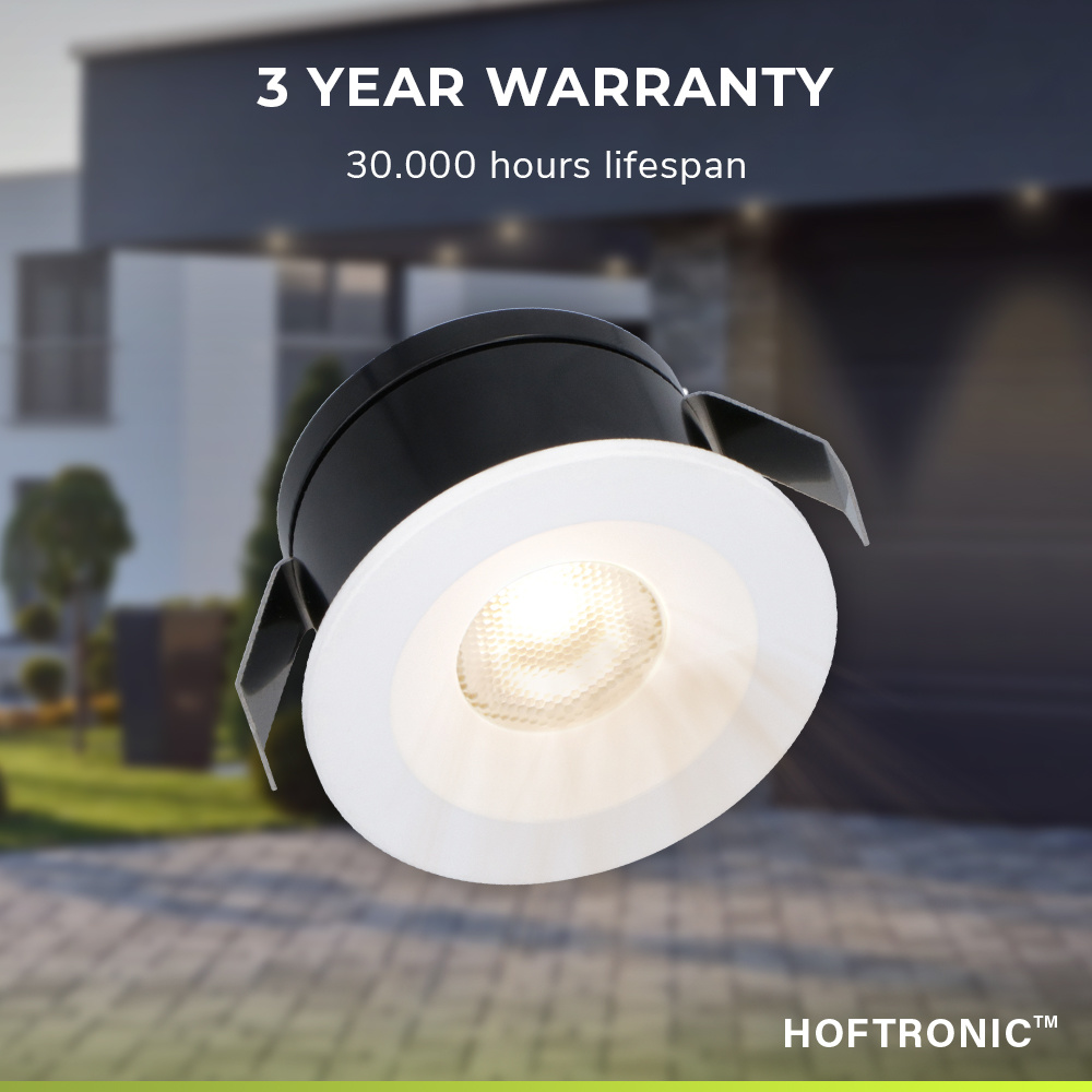 The Cadiz is a white, round, mini LED recessed downlights suitable for porch, canopy and other wet areas. With its small cut size of 40 mm and low built-in depth of only 26 mm, the porch spotlight fits into any ceiling. This spotlight has an IP44 protection class. This also allows you to use it in damp areas such as your bathroom or porch. Thanks to the special anti-glare lens, this spotlight does not blind you when you look into the light.