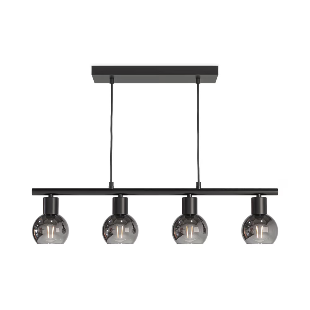 The Glazura 4-spot pendant light acts as the central statement piece. Its long rectangular base and four hanging smoked glass globes give a luxurious art-deco appearance. The lamp is also height-adjustable, allowing you to perfectly suit it to your seating area, dining table, or living space.
