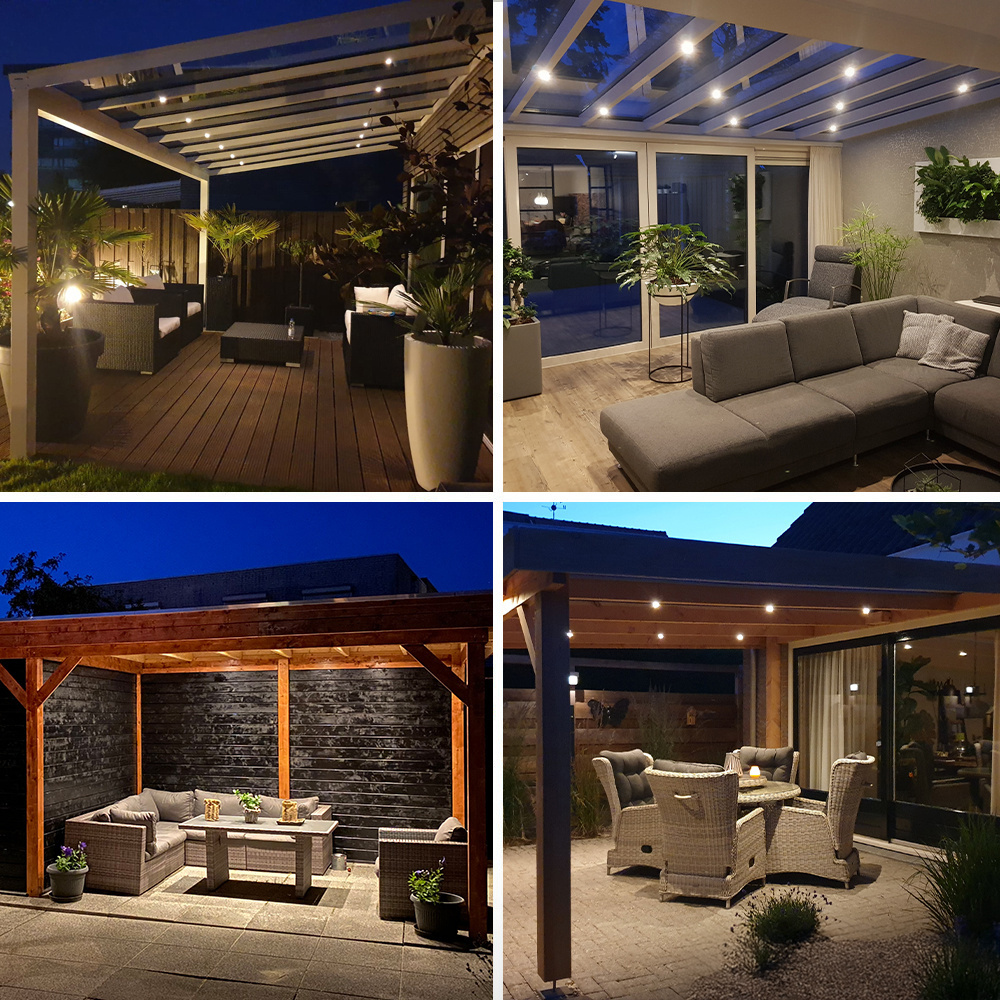 These patio lights are made from maintenance free aluminium. This material is lightweight, does not attract dirt and dust and is easy to clean.