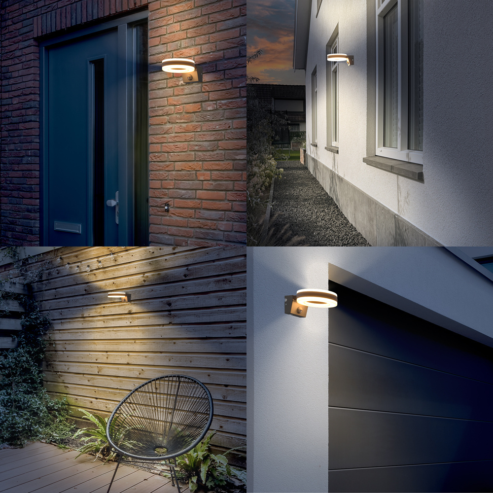 The Corby wall lamp is IP65 waterproof, making it resistant to various weather conditions such as rain, snow, and humidity. The Corby shines an atmospheric warm white light of 3000 degrees Kelvin through 56 LEDs with a total light output of 1800 Lumens. The lamp has a motion sensor with a range of up to 9 meters and a detection angle of 140 degrees, plus an adjustable time delay. This combination ensures that the lamp activates only when there is actual movement nearby.