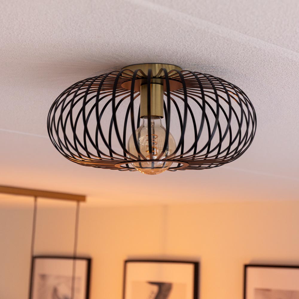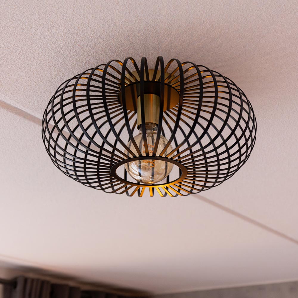The Cosmos ceiling lamp is a beautiful eye-catcher with its black metal strips and golden lamp holder. With this lamp, you are guaranteed to steal the show. The Cosmos has an E27 fitting and comes without a light source. This means you can choose your own light source and easily replace it when necessary. The ceiling lamp is made of metal and has a matte black finish. The Cosmos is also available as a ceiling lamp with a black lamp holder or as a pendant lamp with two spotlights.