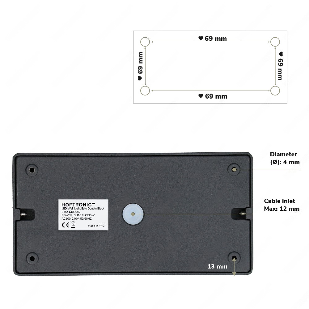 The double Esto is made of maintenance-free aluminum and finished with a black, UV-resistant AKZO-Nobel powder coating. The Esto features a GU10 fitting. This Esto surface-mounted spotlight comes with dimmable GU10 LED spots in the light color 2700 degrees warm white. This light color is very suitable for atmospheric lighting of the bedroom, living room and hallway. The light sources are easy to replace.