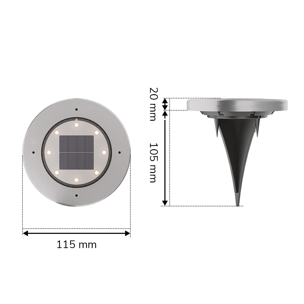 This set of 12 solar in-ground lights features 8 LEDs, giving the in-ground lights much more light output than comparable in-ground lights with 4 LEDs. The Ellis has a built-in twilight switch. This means the in-ground lights switch on automatically when it gets dark. The in-ground lights are IP65 waterproof and are therefore not damaged by moisture and/or dust. The in-ground lights are easy to install using the supplied ground spike.
