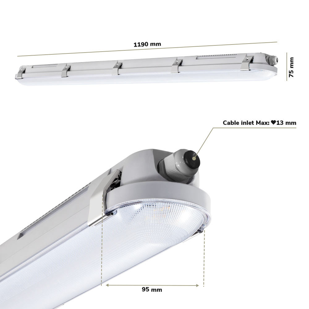 F02 LED fluorescent light with motion sensor 120cm - 40 Watts 5200 lumens (130lm/W) - CCT adjustable light colour - Adjustable Osram Transformer - Replaces 300 Watts - Interconnectable - IK08 - IP66 waterproof