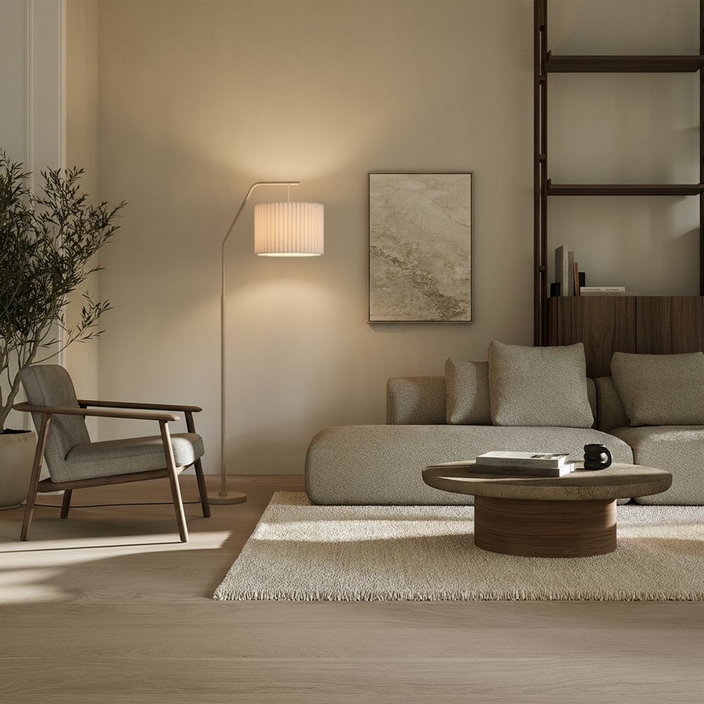 The Selyra lino angolo floor lamp stands out with its open appearance. The pleated linen shade hangs freely from a slender metal stem, which is why it appears to float softly through the room. This construction gives the lamp a light, contemporary look while simultaneously ensuring a clear focus on form and material.