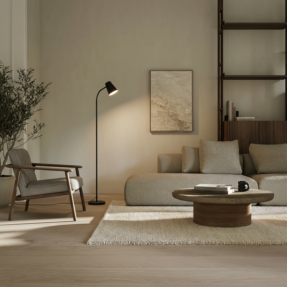 The Tylora floor lamp fits effortlessly into a modern interior, an industrially decorated space or a minimalist living style. Place it next to the sofa as a reading lamp, in a study where focus is needed or in a bedroom where focused light is desired without losing the atmosphere of the room.