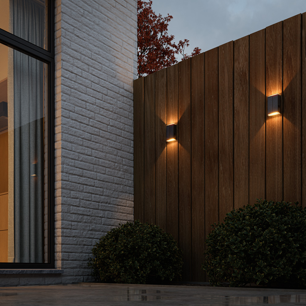 This solar wall light shines light up and down. This creates two beautiful beams of light on your facade, fence or shed. Stylish and modern.