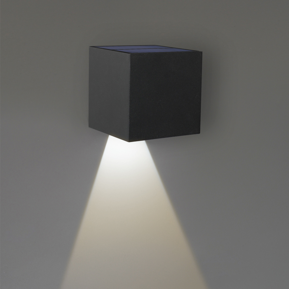 The Kansas Solar Wall Light XL consists of a mounting plate and a cube-shaped lamp. You simply attach the mounting plate to the desired location on the wall or fence, then slide the wall light over the mounting plate and you're done!