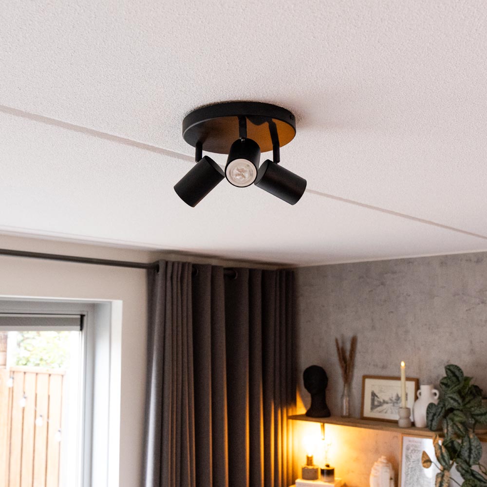 The Lark round ceiling spotlight is a beautiful eye-catcher. This modern lamp has 3 spotlights that are both tiltable and rotatable. The Lark has GU10 fittings and comes without a light source. This means you can choose your own light source and easily replace it when necessary. The ceiling lamp is made of metal and has a matte black finish.