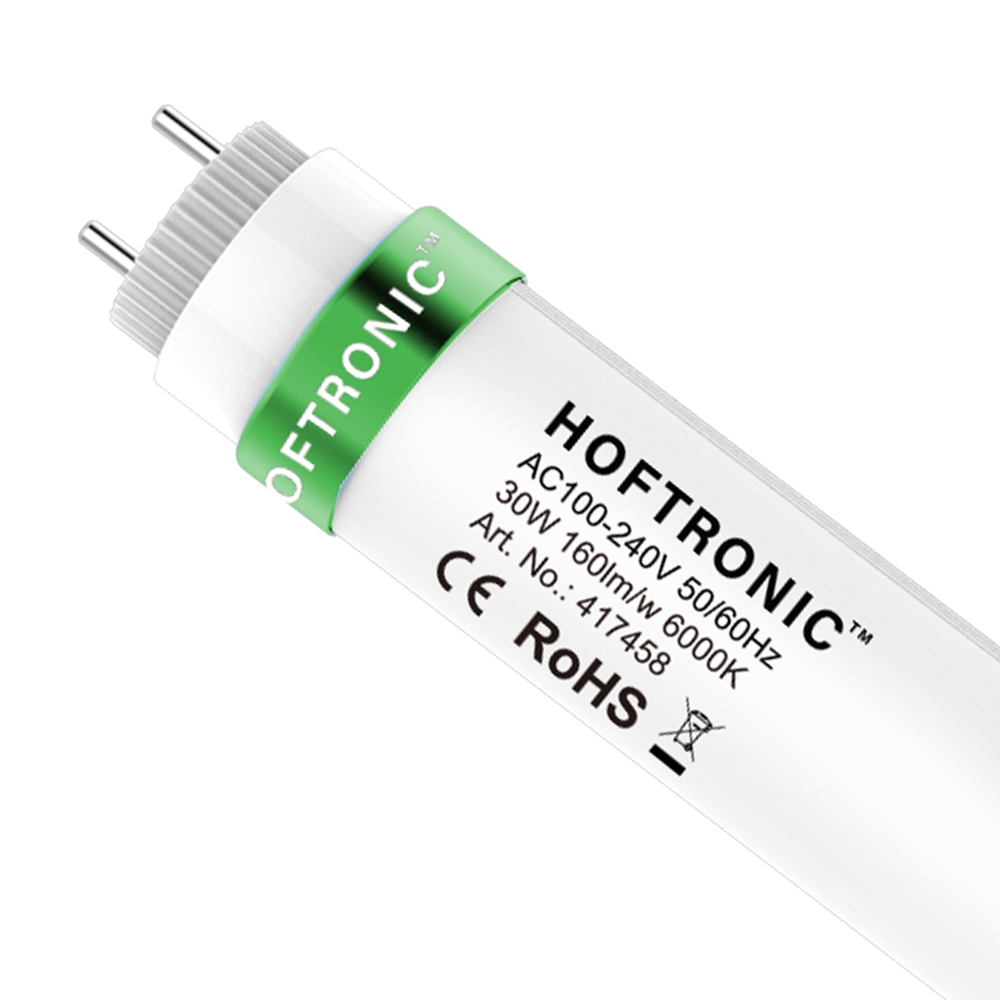 This economical LED fluorescent light features two T8 fittings. Two LED fluorescent lights are supplied with the lamp. These consume only 30 Watt and produce 9600 lumens of light. This is an efficiency of 160 lumens per Watt. As a result, this LED fluorescent light replaces a 120 Watt fluorescent lamp. The LED fluorescent light has an IP20 protection class. This means that the lamp is only suitable for dry indoor areas. The light from the LED fluorescent light is completely flicker-free.