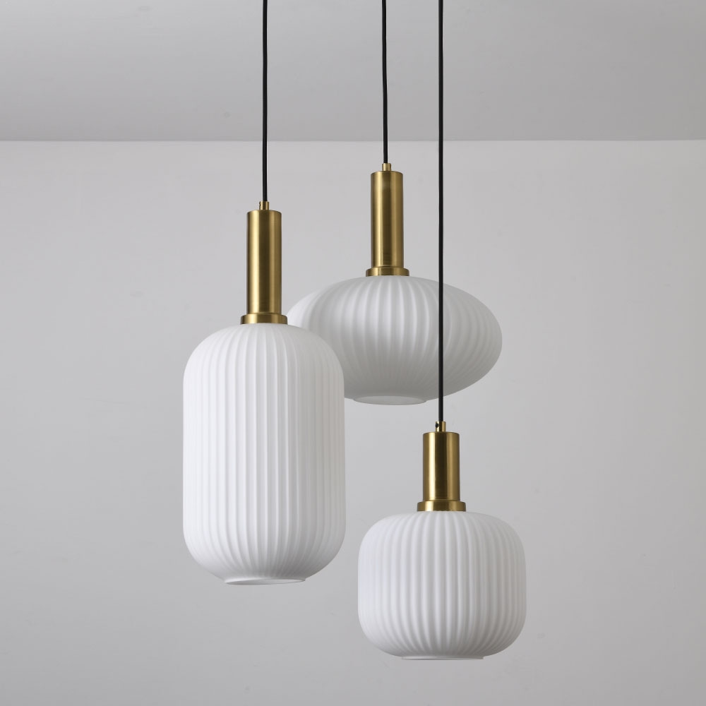The three glass spheres in different shapes hang alternately, and the white shades allow the light to descend softly, slowly filling the room and subtly illuminating the space. In addition, the ribbed, handmade opal glass creates a timeless look and allows shapes and styles to merge. Combined with the gold accents, this creates a refined contrast between rugged and modern.