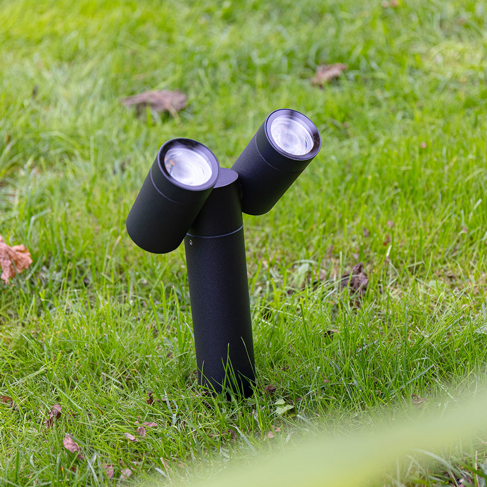 The two spots of this garden spike lights are independently tiltable up to 317 degrees. This allows you, for example, to use 1 spotlight to illuminate your garden path and one spotlight to illuminate a tree. The Pinero shines an atmospheric neutral white light of 4000 degrees Kelvin. The pinero consumes only 8 Watts, producing 690 Lumens of light. The garden spike light has a beam angle of 38 degrees. Because of this narrow beam, applying light accents is very easy.