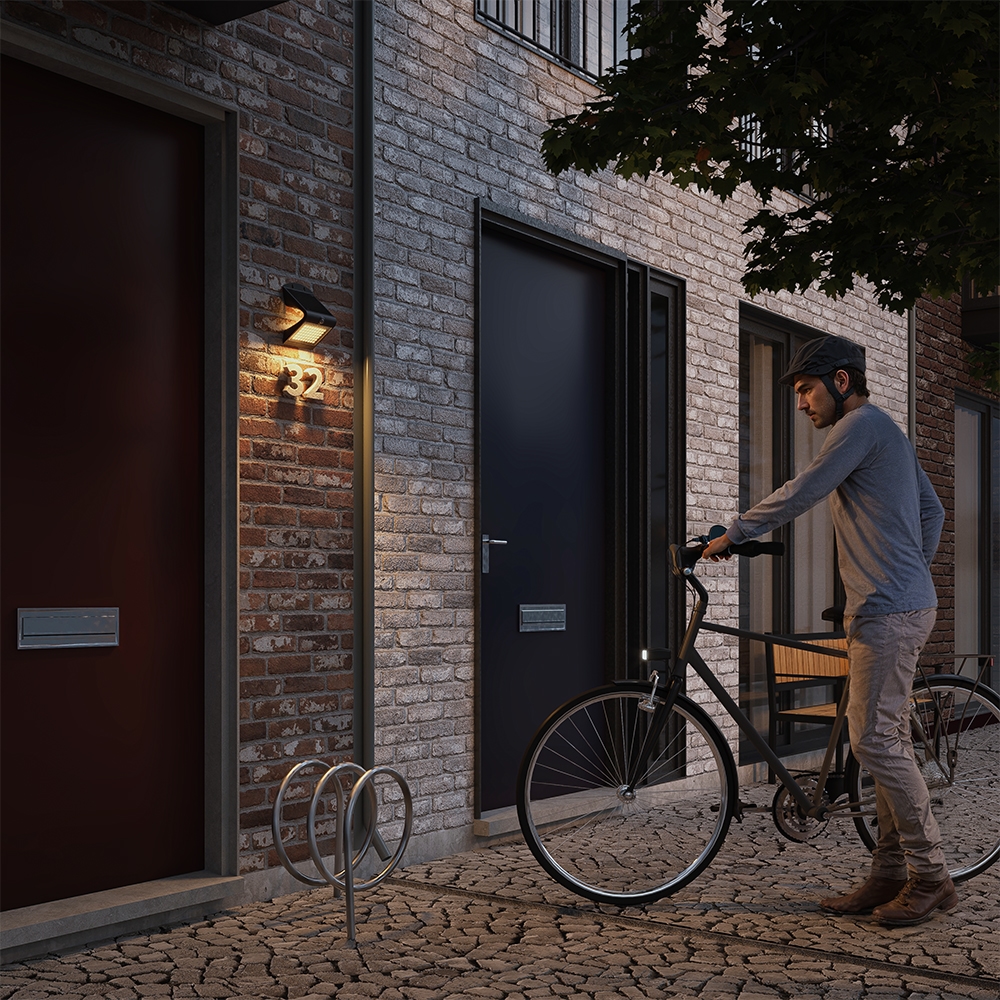 The solar-powered wall light is sensitive to movement. Depending on the light mode set, the lamp will get brighter or switch on when it detects movement.