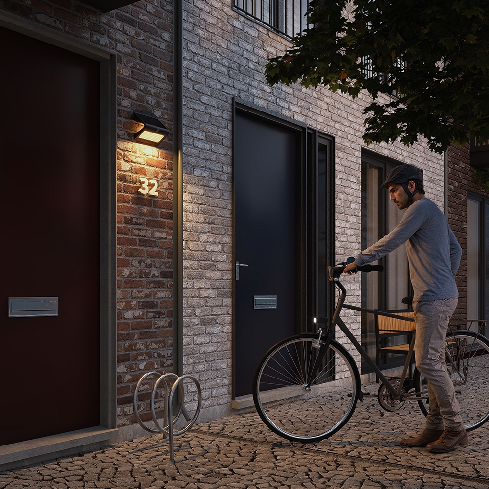The solar-powered wall light is sensitive to movement. Depending on the light mode set, the lamp will get brighter or switch on when it detects movement.