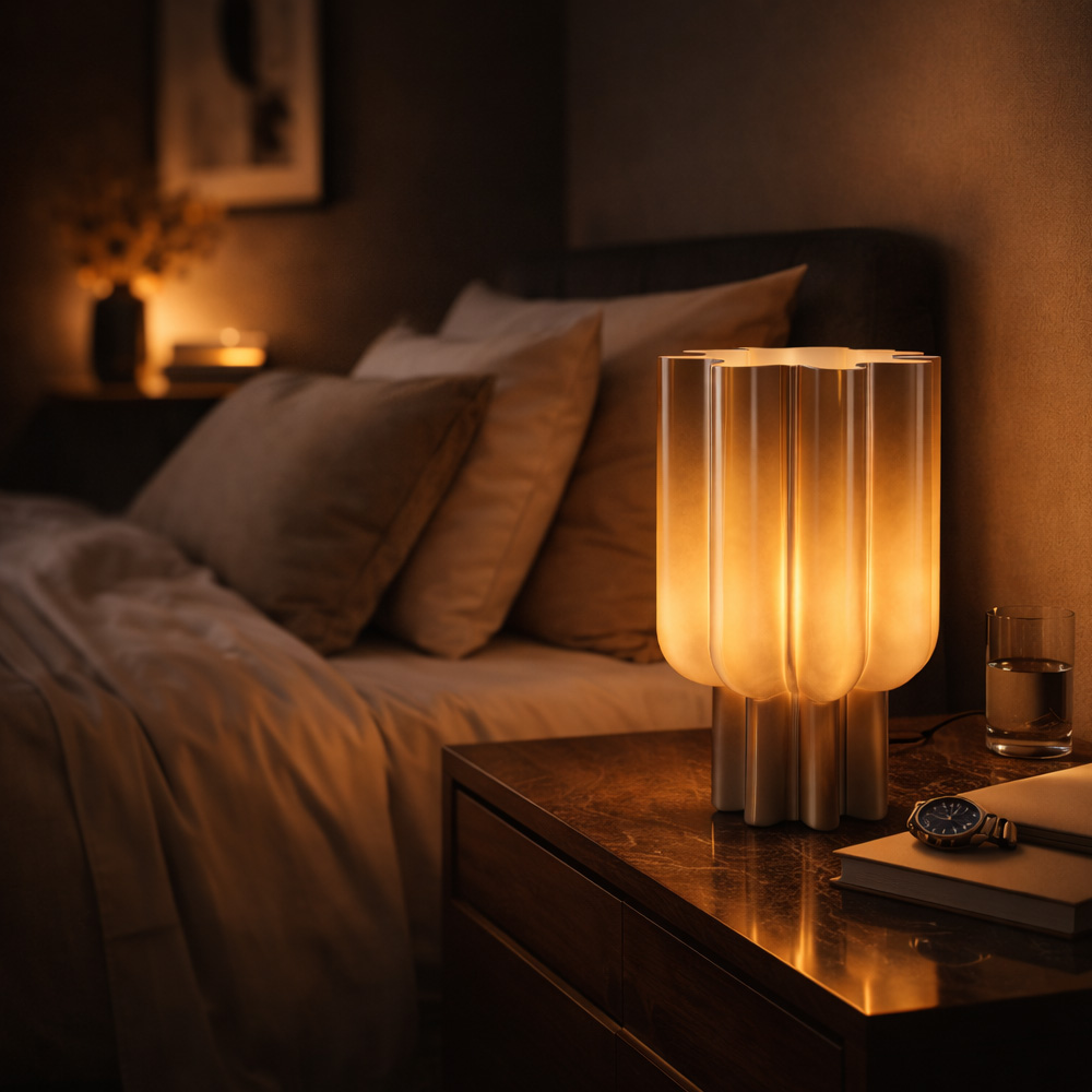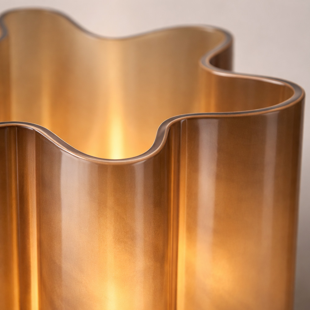 The warm, soft colour gives the glass an almost translucent glow. When lit, the material illuminates from within, filtering through the glass rather than radiating brightly. This softens shadows and creates an intimate, tranquil atmosphere.