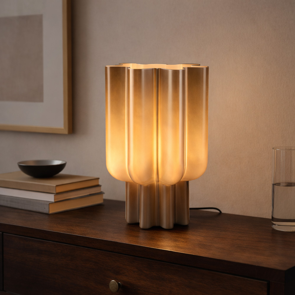The Gessari glass table lamp is a masterclass in form and light. The design features vertical, slightly undulating lines that converge into a rhythmic silhouette. The base and shade flow seamlessly together, making the lamp feel like a single, seamless object, carefully crafted from glass.