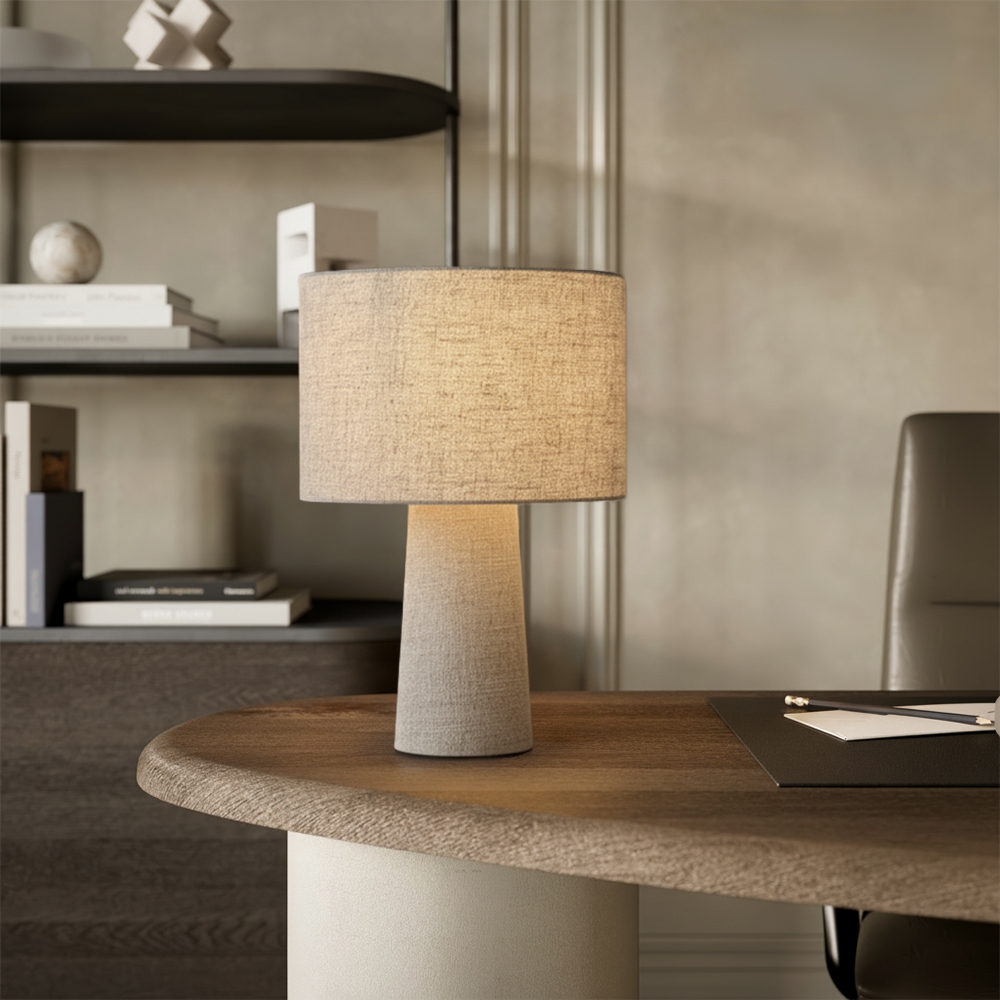 The Melyro lino table lamp has a soft, rounded shape reminiscent of a mushroom, but lighter and more refined. The linen looks sturdy and full, giving the lamp a distinct presence.