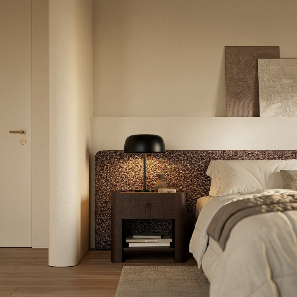 The black finish enhances the lamp’s understated character. The light is focussed under the shade and subtly diffused all around, making the Voryn suitable as mood lighting on a side table, dresser or bedside table. The round metal base provides stability and ensures the design is visually balanced.